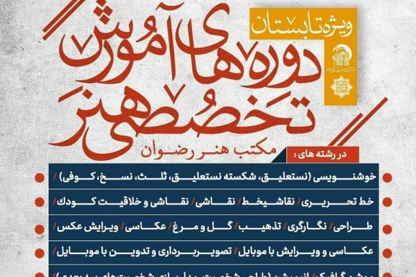 جواد براتی، مسئول مکتب هنر رضوان در این باره در گفت وگو با روابط عمومی در این باره اظهارکرد: این دوره های تخصصی هنری در رشته های خوش نویسی(نستعلیق، شکسته نستعلیق، ثلث، نسخ و کوفی)، خط تحریری، نقاشی خط، نقاشی، نقاشی و خلاقیت کودک، طراحی، نگارگری، تذهیب، گل و مرغ، عکاسی، ویرایش عکس، عکاسی و ویرایش با موبایل، تصویربرداری و تدوین با موبایل، موشن گرافیک، انیمیشن(طراحی شخصیت، مدل سازی شخصیت های سه بعدی) برگزار خواهد شد.