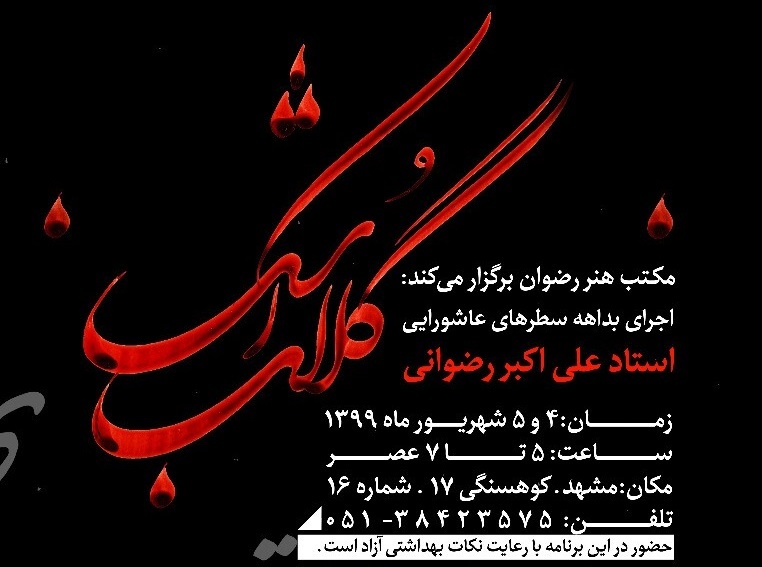 به گزارش روابط عمومی، این ویژه برنامه با اجرای بداهه سطرهای عاشورایی علی اکبر رضوانی استاد و هنرمند برجسته خوش نویسی مشهد زیر نظر مکتب هنر رضوان وابسته به مؤسسه آفرینش های هنری آستان قدس رضوی در روزهای چهارم و پنجم شهریور 1399 از ساعت 17 تا 19 در نگارخانه رضوان برگزار خواهد شد.