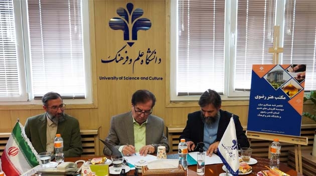 مراسم امضای تفاهمنامه همکاری میان دانشگاه علم و فرهنگ و مؤسسه آفرینشهای هنری آستان قدس رضوی، صبح دوشنبه (۵ آبانماه) با حضور دکتر محمدحسین ایمانی خوشخو سرپرست دانشگاه علم و فرهنگ، امیرمهدی حکیمی مدیرعامل مؤسسه آفرینشهای هنری آستان قدس رضوی، و محمدجواد استادی مدیرکلان پروژه «مکتب هنر رضوی» در محل دانشگاه علم و فرهنگ برگزار شد.