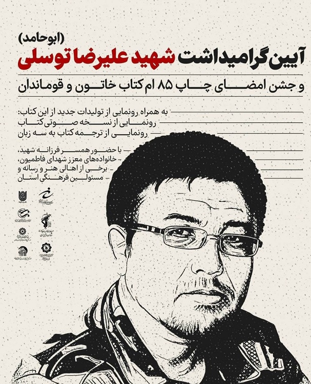 با مشارکت مؤسسه آفرینشهای هنری آستان قدس رضوی، آیین گرامیداشت شهید علیرضا توسلی(ابوحامد) و جشن امضای چاپ هشتاد و پنجمین کتاب «خاتون و قوماندان» در مشهدمقدس برگزار میشود.