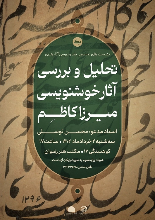 همزمان با دهه کرامت، نخستین نشست از سلسله نشست‌های تخصصی «نقد و بررسی آثار هنری» با محوریت تحلیل و بررسی آثار خوشنویسی میرزا کاظم با حضور محسن توسلی مدرس و هنرمند برجسته مشهدی، سه‌شنبه 2 خرداد 1402 از ساعت 17 در مکتب هنر رضوان برگزار می‌شود.