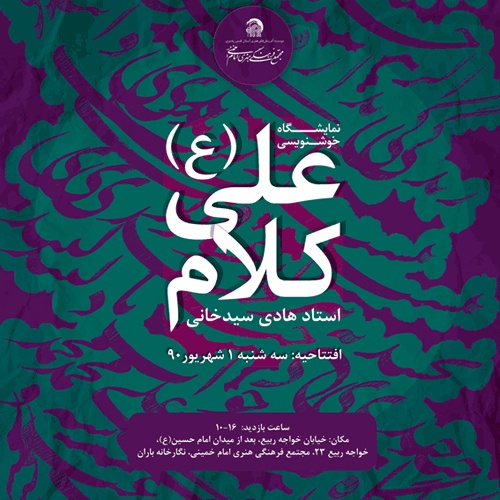 نمایشگاه خوشنویسی " کلام علی (ع)" ویِژه آثار استاد هادی سیدخانی در نگارخانه باران برگزار می شود. به گزارش روابط عمومی مجتمع فرهنگی هنری امام خمینی (ره) افتتاحییه این نمایشگاه سه شنبه یکم شهریورماه ساعت 10 صبح برگزار خواهد شد. علاقمندان می توانند همه روزه از ساعت 10 الی 16 به محل نگارخانه باران ( خیابان خواجه ربیع، خواجه ربیع 23، مجتمع فرهنگی هنری امام خمینی (ره) ) مراجعه نمایند.