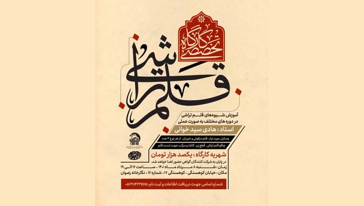 این کارگاه با هدف آموزش شیوههای قلمتراشی در دورههای مختلف به صورت عملی توسط هادی سیدخوانی مدرس برجسته خوشنویسی، شنبه، 8 مرداد 1401، از ساعت 16 تا 19 در نگارخانه رضوان مشهد واقع در خیابان کوهسنگی 17، شماره 16 برپا خواهد شد.