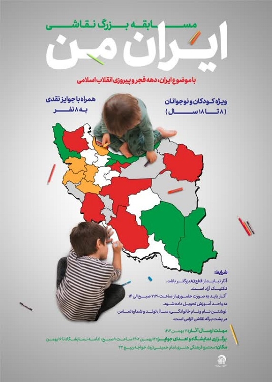 به همت مؤسسه آفرینش‌های هنری آستان قدس رضوی صورت می‌گیرد؛ فراخوان مسابقه بزرگ نقاشی «ایران من» ویژه کودکان و نوجوانان - ۱۴۰۲/۱۱/۰۳