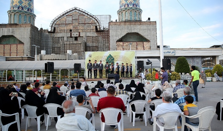 در ادامه راهی محل اجراها می‌شوم. جوار حرم مطهر رضوی در نزدیک اذان مغرب مملو از خیل جمعیت است. وقتی از ورودی باب الرضا(ع) به طرف باب الجواد(ع) می‌روم، نوای سرود «واسه کفترات می‌یارم گاهی آب و گاهی دونه   گاهی نوبتی می‌خونم بالای نقاره‌خونه   خاک پای همه مسافراتم   خادم بی‌ادعای زائراتم...»، در میان همهمه زائران و مجاوران به گوش می‌رسد. در فضایی باز بین این دو ورودی در خارج از حرم مطهر، جایگاه ویژه‌ای به همت آستان قدس رضوی برای اجرای برنامه‌های فرهنگی و هنری ایجاد شده است. مقابل آن نیز صندلی‌ها چیده شده و اهل هنر و معرفت با شوقی خاص نشسته‌اند. بعضی‌ها هم دورتر ایستاده‌اند، اما چشم و دل‌شان پیش دانش‌آموزانی است که بر روی جایگاه در حال اجرای سرود هستند. سیدیحیی موسوی؛ ناظر فنی اجرای سرودهای این مؤسسه می‌گوید: با توجه به مشغله تحصیلی دانش‌آموزان در خردادماه تنها دو گروه سرود منتخب «رویش» و «جوانه‌ها» در ایام دهه کرامت در این جایگاه به اجرای سرودهای رضوی می‌پردازند. این اجراها از آنجایی که به صورت زنده انجام می‌شود، بسیار مورد توجه زائران قرار دارد.