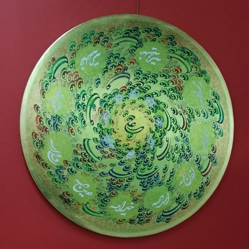 در این تابلو نام مبارک امام علی(ع) به شکل دایره ای و به خط شکسته نستعلیق با مرکب رنگی بر روی ورق طلا، هزار و 100 بار تکرار شده است.