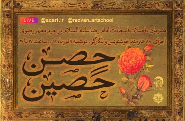 به گزارش روابط عمومی، برنامه حصن حصین با حضور جمعی از هنرمندان خوش نویس و نگارگر در قالب خلق اثر با رعایت فاصله گذاری اجتماعی و تمهیدات بهداشتی زیر نظر مکتب هنر رضوان دوشنبه 9 تیر 99 از ساعت 17 تا 20 در رواق امام خمینی(ره) بارگاه ملکوتی امام هشتم(ع) برگزار و برای مخاطبان به صورت زنده (live) در بستر اینستاگرام پخش خواهد شد.