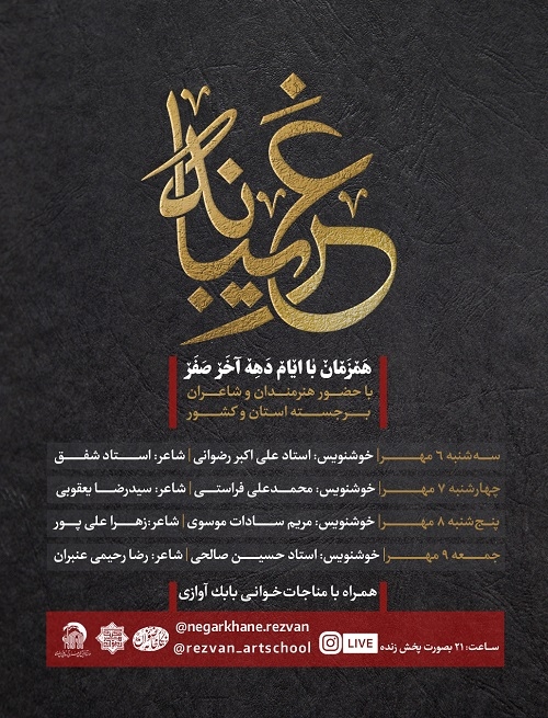 همزمان با ایام دهه آخر صفر ، ویژه برنامه غریبانه با حضور هنرمندان و شاعران برجسته استان وکشور در نگارخانه رضوان برگزار می شود .