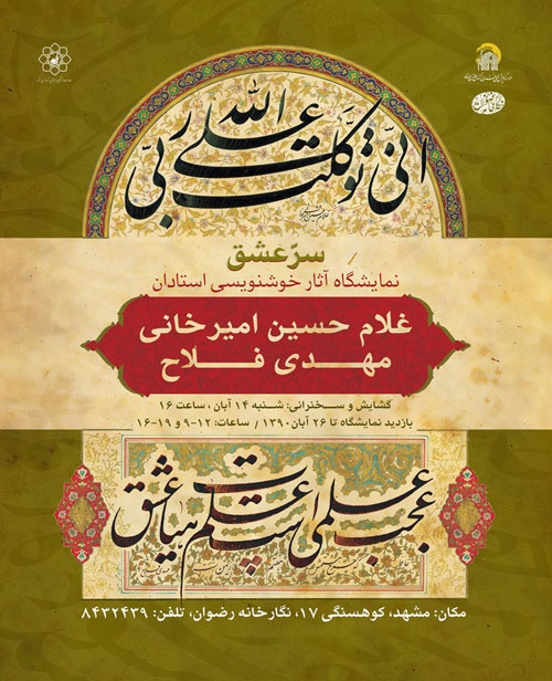 به گزارش روابط عمومی موسسه آفرینش های هنری آستان قدس رضوی، محمد ضرابی با اشاره به برگزاری نمایشگاه خوشنویسی در نگارخانه رضوان اظهار داشت: استاد امیر خانی و فلاح از اساتید برجسته خوشنویسی کشور هستند که در نمایشگاه سر عشق 40 اثر این هنرمندان به نمایش در می آید. وی تصریح کرد: این آثاربا موضوع عرفانی و ادبی و با تکنیک خوشنویسی و نقاشی خط اجرا شده و نمایشگاه این آثار تا 26 آبان ماه سال جاری در نگارخانه رضوان مشهد برپاست. مدیرعامل موسسه آفرینش های هنری آستان قدس رضوی همچنین به سخنرانی و نشست پرسش و پاسخ استاد امیرخانی و فلاح اشاره کرد و بیان داشت: این نشست پیرامون فعالیت این هنرمندان، در ساعت 16 روز شنبه 14 آبان، همزمان با مراسم افتتاحیه نمایشگاه سرعشق در نگارخانه رضوان برگزار خواهد شد. ضرابی در ادامه به معرفی برگزیدگان مسابقه مکتب+ خانه در این مراسم اشاره کرد و بیان داشت: فراخوان مسابقه خوشنویسی مکتب+خانه در دهه میلاد امام رضا(ع) منتشر و140 اثر از 66 هنرمند به دبیرخانه این مسابقه ارسال شد. وی با بیان اینکه این مسابقه با هدف کاربردی کردن هنر خوشنویسی صورت گرفته است، اذعان داشت: القاب و احادیث رضوی از موضوعات محوری این مسابقه بوده است و تکنیک آن نیز به صورت آزاد هدف گذاری شده است. مدیرعامل موسسه آفرینش های هنری آستان قدس رضوی همچنین به داوری این آثار توسط محمد علی فراستی، کاظم خراسانی، هادی ذوالریاستین، محسن عبادی و محسن توسلی اشاره کرد و بیان داشت: در افتتاحیه نمایشگاه سر عشق از 5 نفر برگزیده در سطح هنرجویان و همچنین 2 اثر در بخش اساتید تجلیل و تقدیر می شود. ضرابی در ادامه به رونمایی دو کتاب تازه منتشر شده درموسسه آقرینش های هنری آستان قدس رضوی در این مراسم اشاره کرد و بیان داشت: کتاب تذهیب های قرآنی که به معرفی آثار دومین دوسالانه این جشنواره می پردازد یکی از این کتاب ها است که توسط این موسسه و در دو هزار نسخه منتشر شده است. وی ادامه داد: کتاب ادعیه ایام هفته به خط محمد شفیع تبریزی دیگر کتاب رونمایی شده در این مراسم است که با خط نسخ و در 20 صفحه 8 سطری در سال 1226 کتابت شده و با همکاری سازمان کتابخانه های آستان قدس رضوی و در یک هزار و 500 نسخه منتشر شده است.
