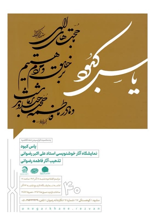 به مناسبت فرارسیدن دهه فاطمیه، نمایشگاهی از آثار خوشنویسی استاد علی اکبر رضوانی هنرمند برجسته خط شکسته نستعلیق با عنوان «یاس کبود» در نگارخانه رضوان مشهد برگزار میشود.