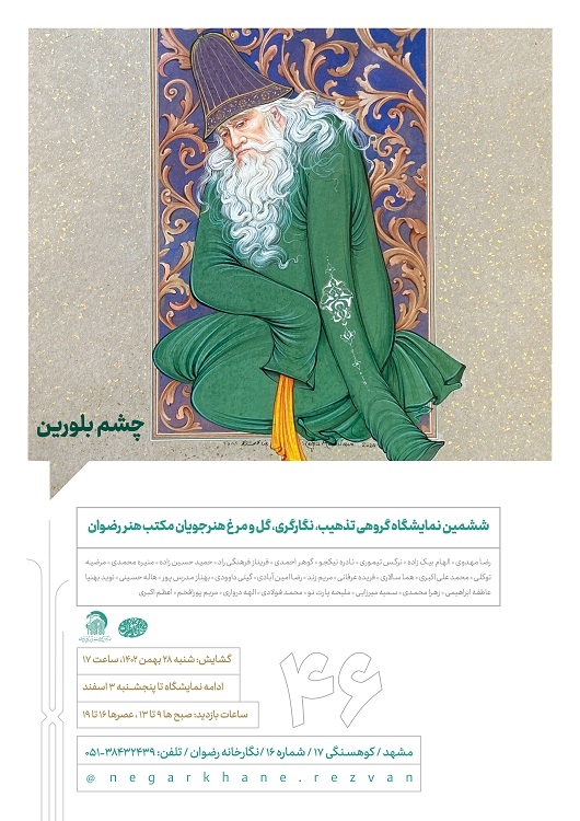 ششمین نمایشگاه گروهی تذهیب، نگارگری و گل و مرغ هنرجویان مکتب هنر رضوان وابسته به مؤسسه آفرینشهای هنری آستان قدس رضوی با عنوان «چشم بلورین» در نگارخانه رضوان مشهد گشایش مییابد.