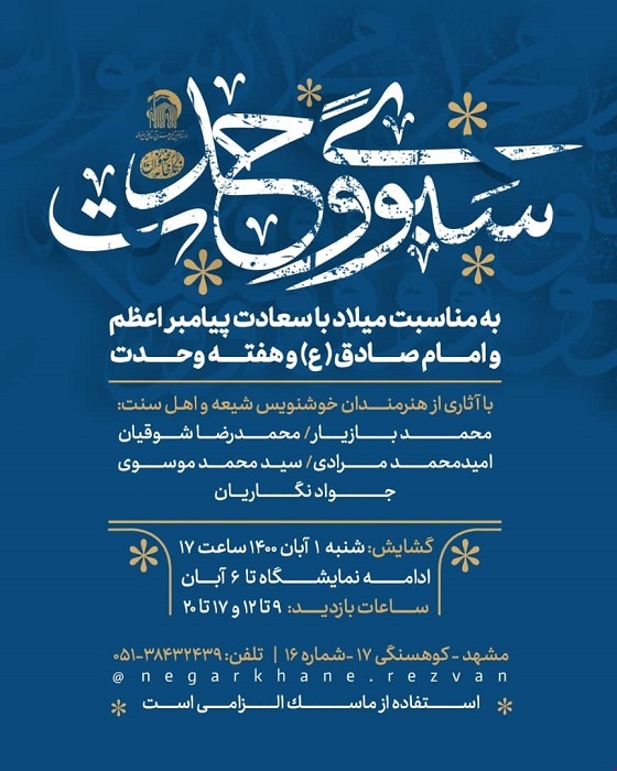 همزمان با ولادت پیامبر اسلام حضرت محمد مصطفی (ص) آیین گشایش نمایشگاه خوشنویسی "سبوی وحدت " در نگارخانه رضوان برگزار می شود .